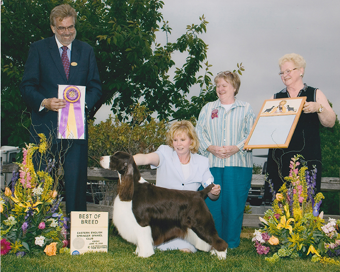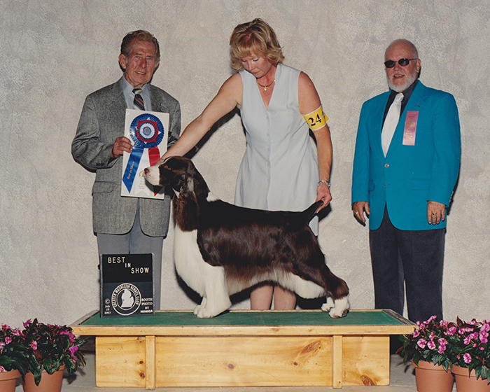 Mel won the Pedigree Award for Springers in 2003 and was Best of Opposite at our 2004 National. He won 3 BIS and had many group placements. He is the first Telltale dog to earn his novice agility title, which Celie put on him in 1997. Mel's retirement home is with a loving family in the Windy City.